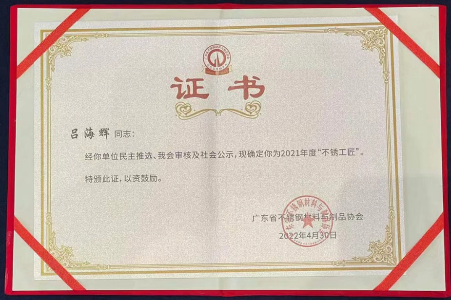 不僅是大國工匠,還是不銹工匠,他們具有著追求卓越的創造精神、精益求精的品質精神、用戶至上的服務精神,無不展現著“工匠精神”!伴隨著這份證書的獲得,我司漢高定將不忘初心,為實現“百年夢”奠定堅實的基礎!
